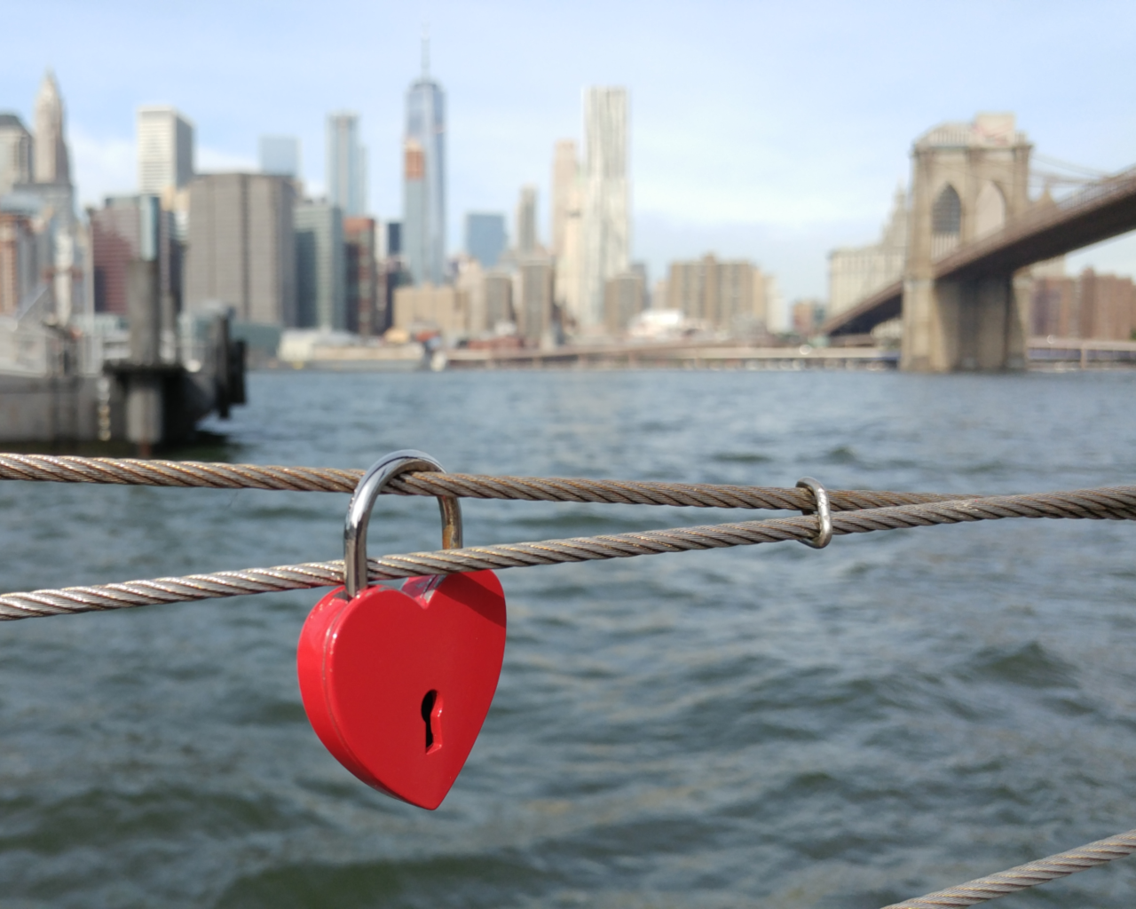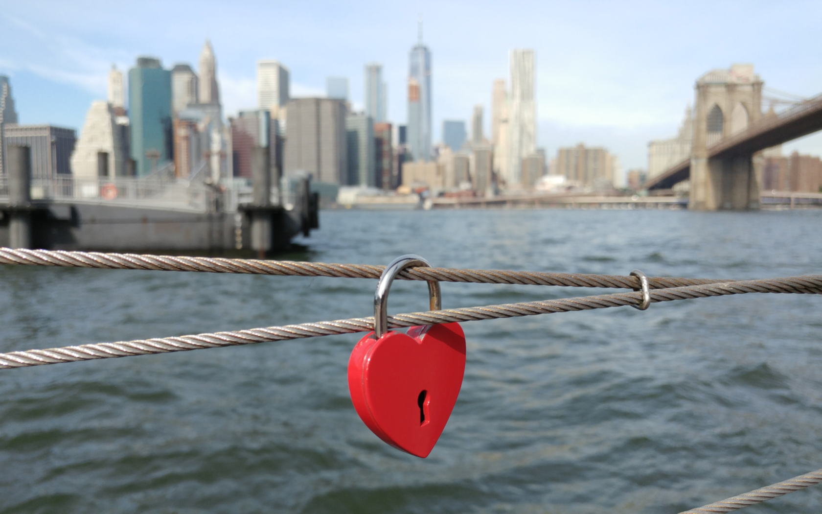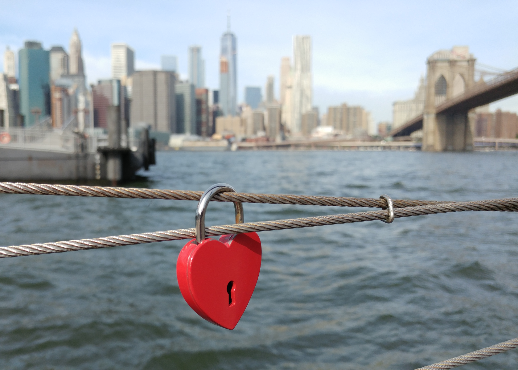 A heart shaped lock locked to a fence overlooking the East River. Manhattan is in the background with One World Trade Center in the center and the Brooklyn bridge to the right. Taken October 2017.