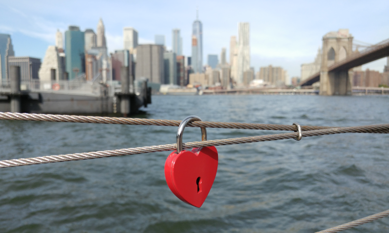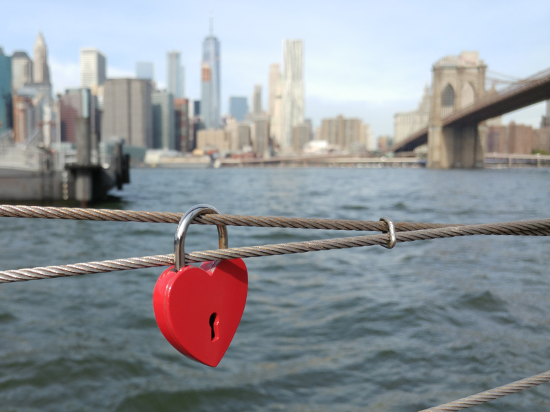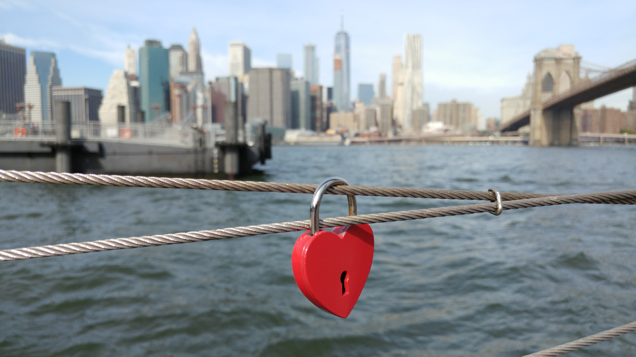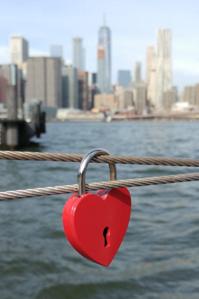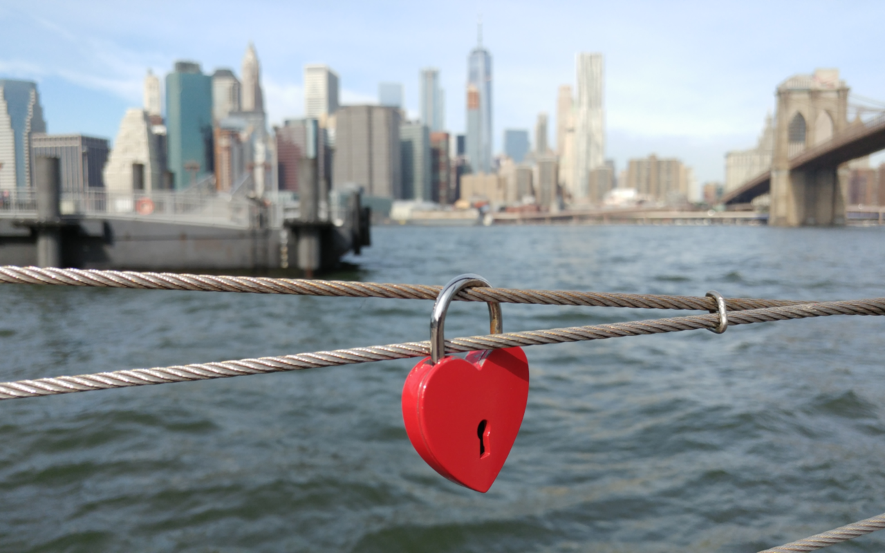 A heart shaped lock locked to a fence overlooking the East River. Manhattan is in the background with One World Trade Center in the center and the Brooklyn bridge to the right. Taken October 2017.