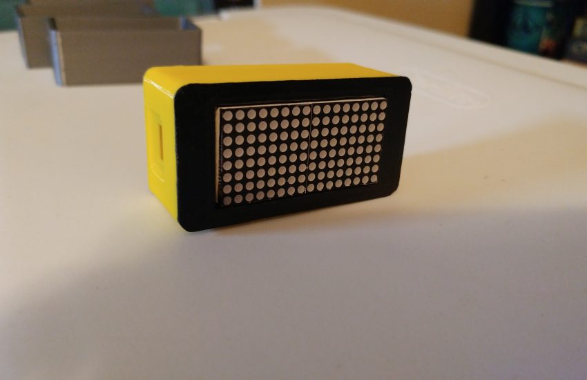 This is a slim enclosure for an Adafruit Feather development board with an accompanying 8×16 Matrix featherWing. The enclosure was designed to be used with the Short Feather Headers Kit to make it as compact as possible. Power is supplied by the USB port. The STL files can be downloaded from Thingiverse.